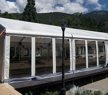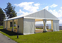Двери     Шторы-стенки каркасно-тентового сооружения сделаны из тентовой ткани - гибкой и воздухонепроницаемой. Их можно раздвинуть, убрать вовсе или сделать "глухой". Есть шторы с окнами, будучи прозрачными, они сохраняют достоинства непрозрачных штор: сдвигаются- роздвигаются.